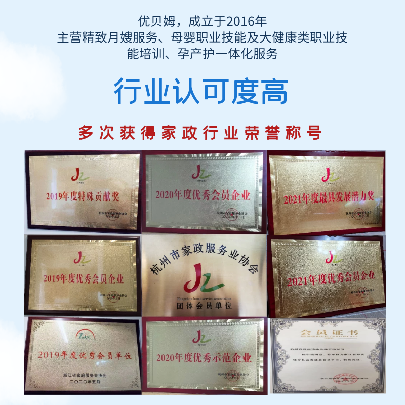 杭州優(yōu)貝姆健康管理有限公司,成立于2016年,是一家致力于打造集定制居家月嫂服務、孕產(chǎn)護一體化服務、母嬰健康管理培訓學校為一體的現(xiàn)代化母嬰健康管理企業(yè)。 連續(xù)多年被浙江省家政協(xié)會及杭州市家政協(xié)會評為:“優(yōu)秀會員單位”“家政示范企業(yè)”“特殊貢獻獎”等殊榮。 多次在浙江省家政技能比賽中獲得優(yōu)異成績,并代表浙江省參加“長三角家政技能大賽”并取得優(yōu)異成績。